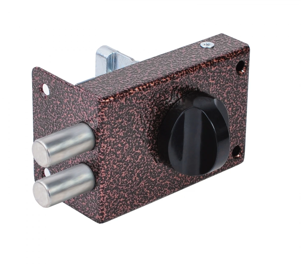 Замок накладной цилиндровый ЗН-1 2Р с пластинчатым цилиндровым механизмом секрета. Предназначен для установки в деревянные и стальные двери правого и левого открывания толщиной до 45 мм. Окрашен полимерной краской. Засов из двух стальных ригелей диаметром 14 мм. Закрывание и открывание изнутри производится вертушкой, снаружи ключом. Имеется блокировка от открывания ключом снаружи, путем доворота вертушки в крайнее положение при открытом ригеле. Механизм секрета цилиндрический односторонний с английским ключом. Комплектуется 4-мя ключами, запорной коробкой и накладкой. Цвет: медь.